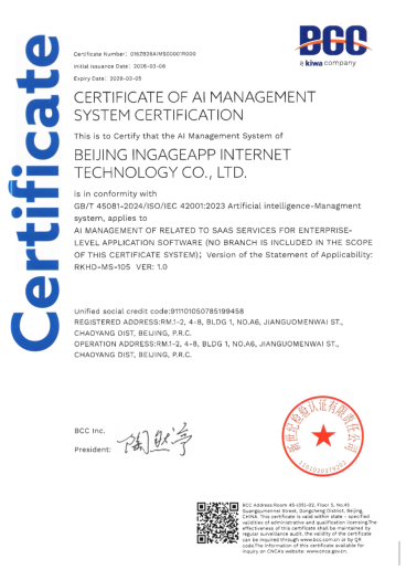 作为全球首个针对人工智能(AI)治理的国际标准,ISO 42001 是衡量企业负责任、安全地开发和使用 AI 技术的“金标准”。销售易CRM凭借自身过硬的实力,成功满足了国际顶尖标准: